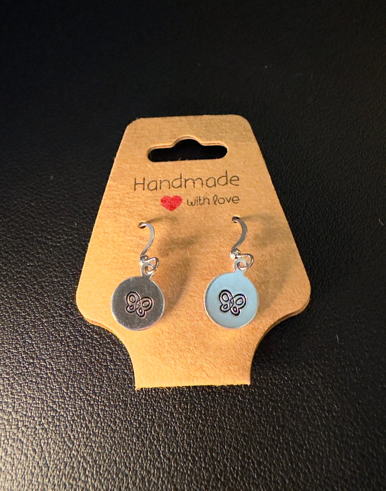 Rounded aluminum disks stamped with a butterfly. The aluminum disk is stamped and painted by hand. The hooks are surgical steel. Each earring is handmade and will show small differences from the images.