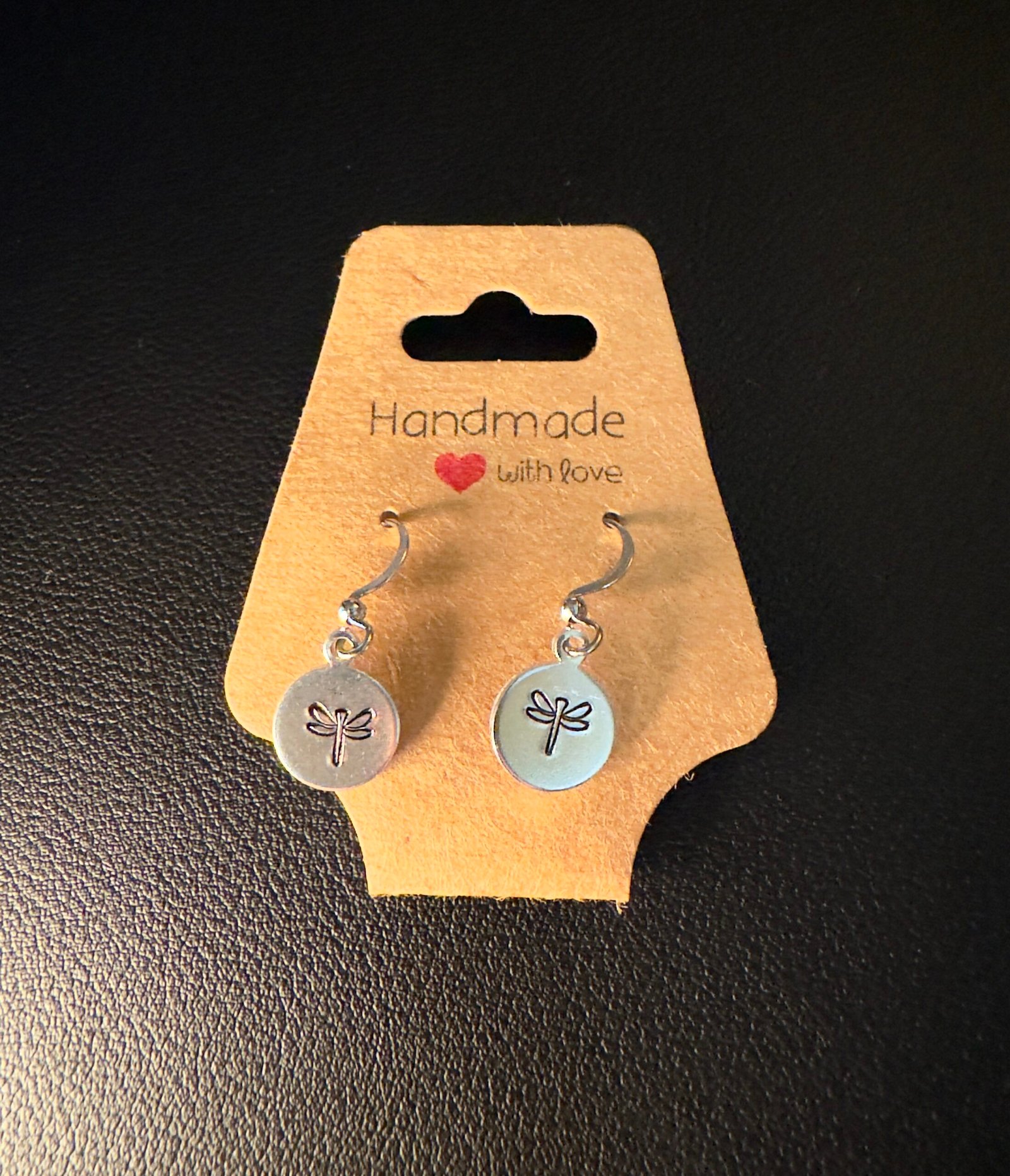 Rounded aluminum disks stamped with a dragonfly. The aluminum disk is stamped and painted by hand. The hooks are surgical steel. Each earring is handmade and will show small differences from the images.