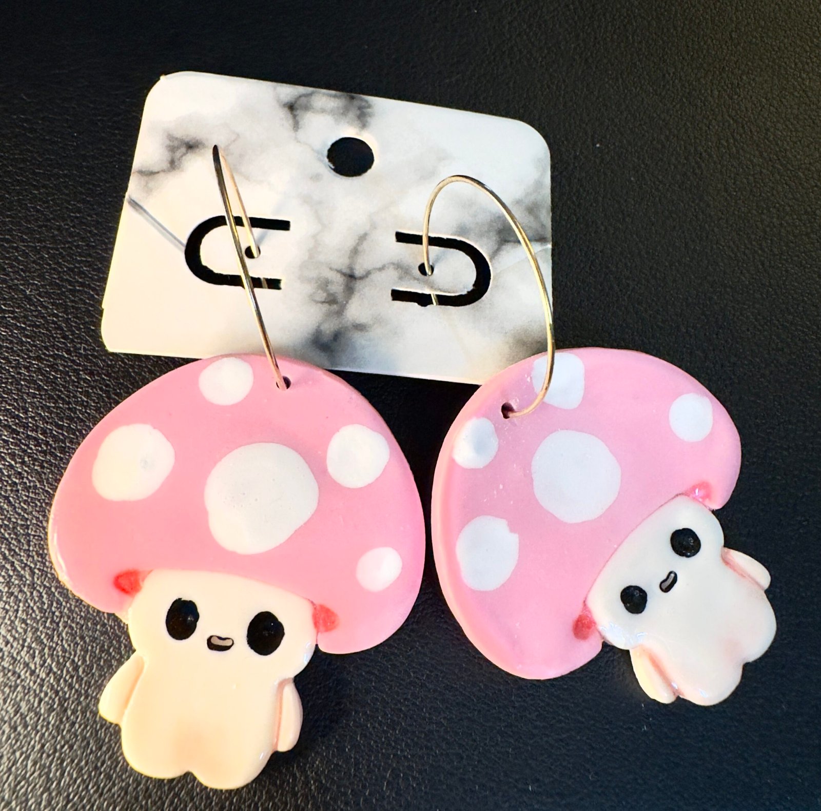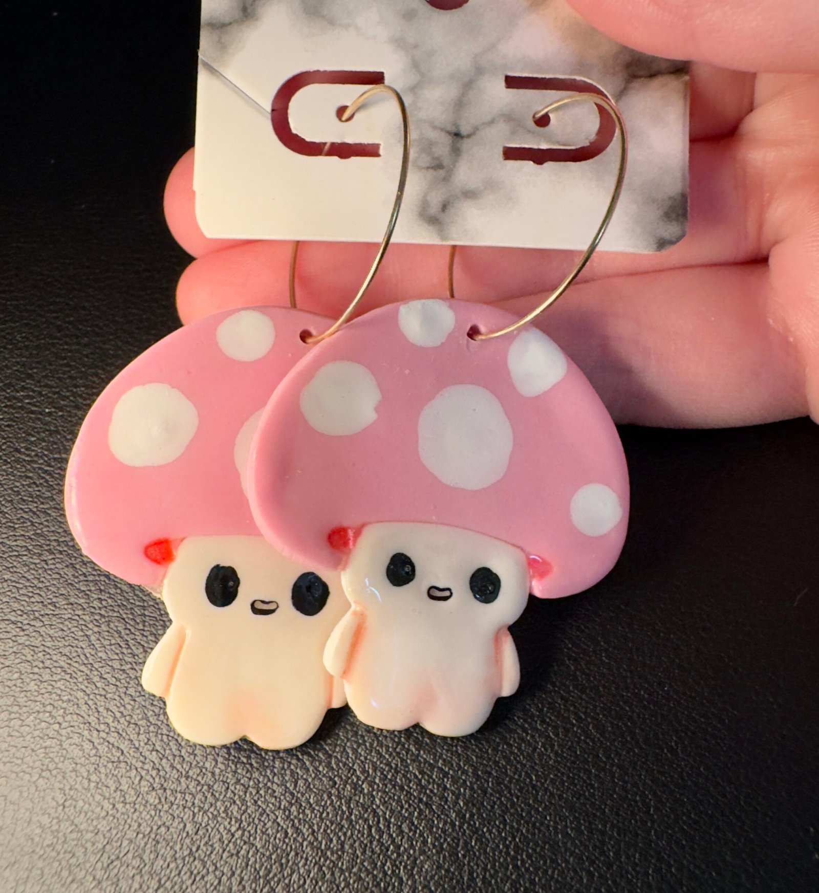 Big pink mushrooms made from polymer clay. The clay and paint are hand done and a thin coat of UV risen is applied to get a little shine. The hoops are surgical steel with a gold platted finish. Each earring is handmade and will show small differences from the images.