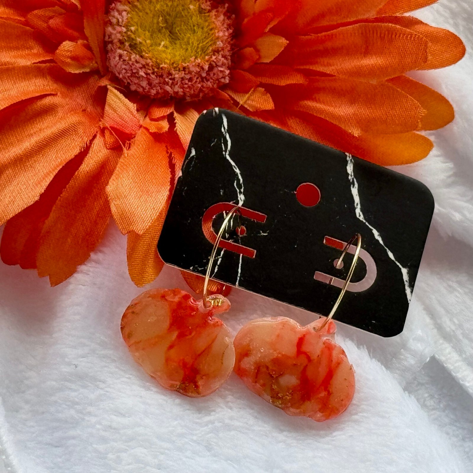 Orange marble pumpkin earrings on hoops.