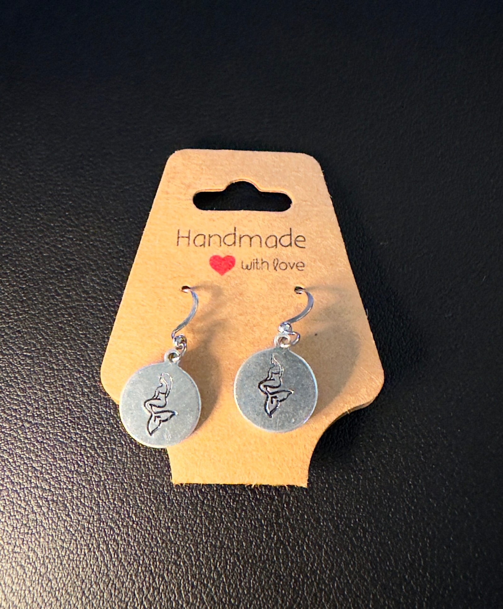 Rounded aluminum disks stamped with a mermaid. The aluminum disk is stamped and painted by hand. The hooks are surgical steel. Each earring is handmade and will show small differences from the images.