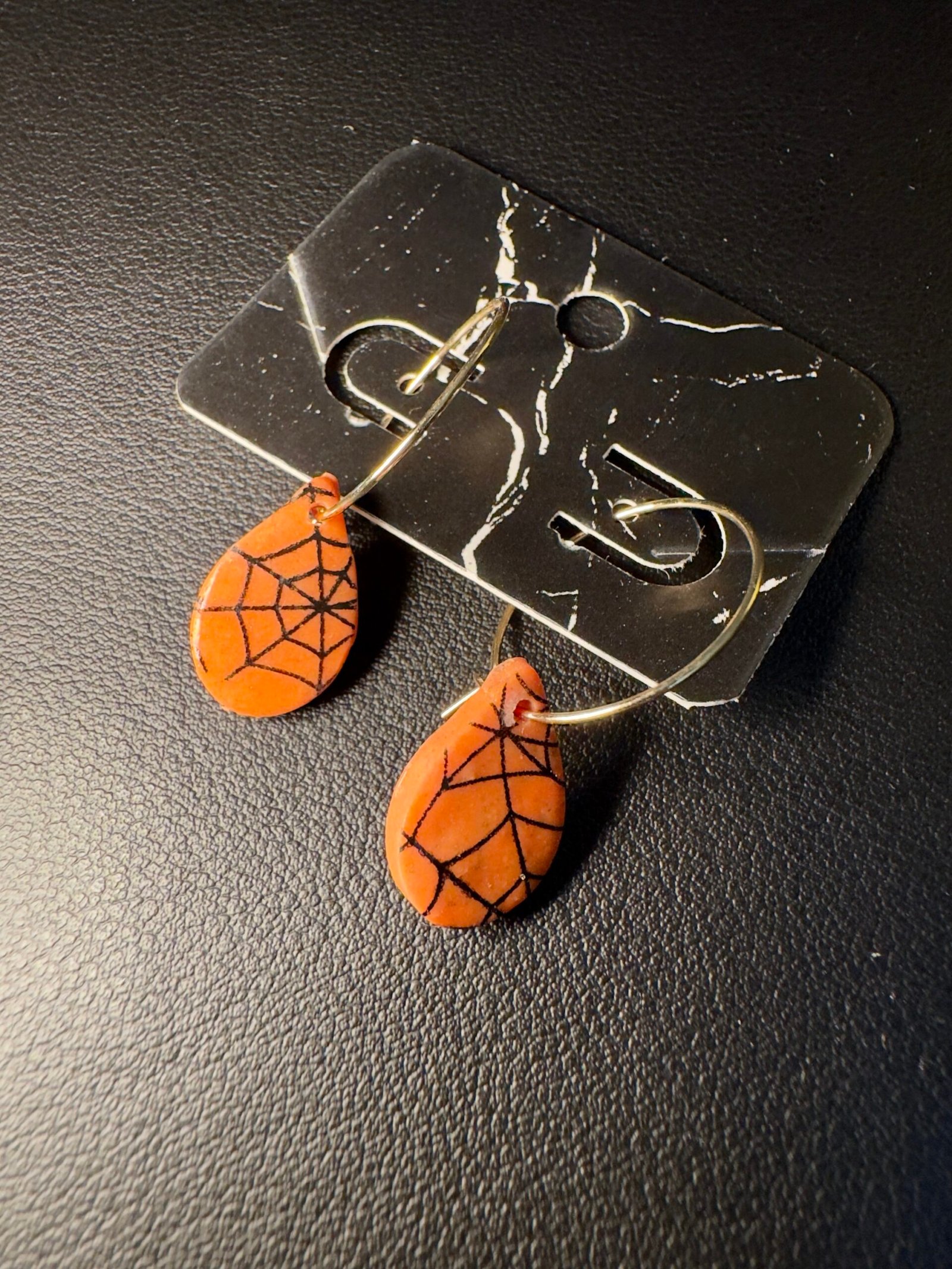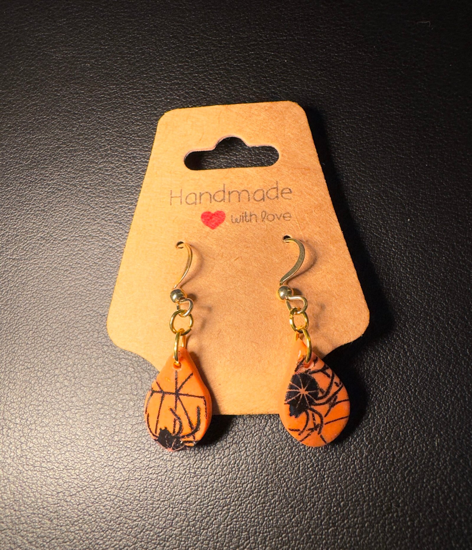 Orange tear drop polymer clay earrings with black spider silk screen on them. The clay was mixed by hand to achieve that nice orange color and sealed in a coat of UV resin to get that nice shine that attracts the eye. The hooks are surgical steel gold plated.