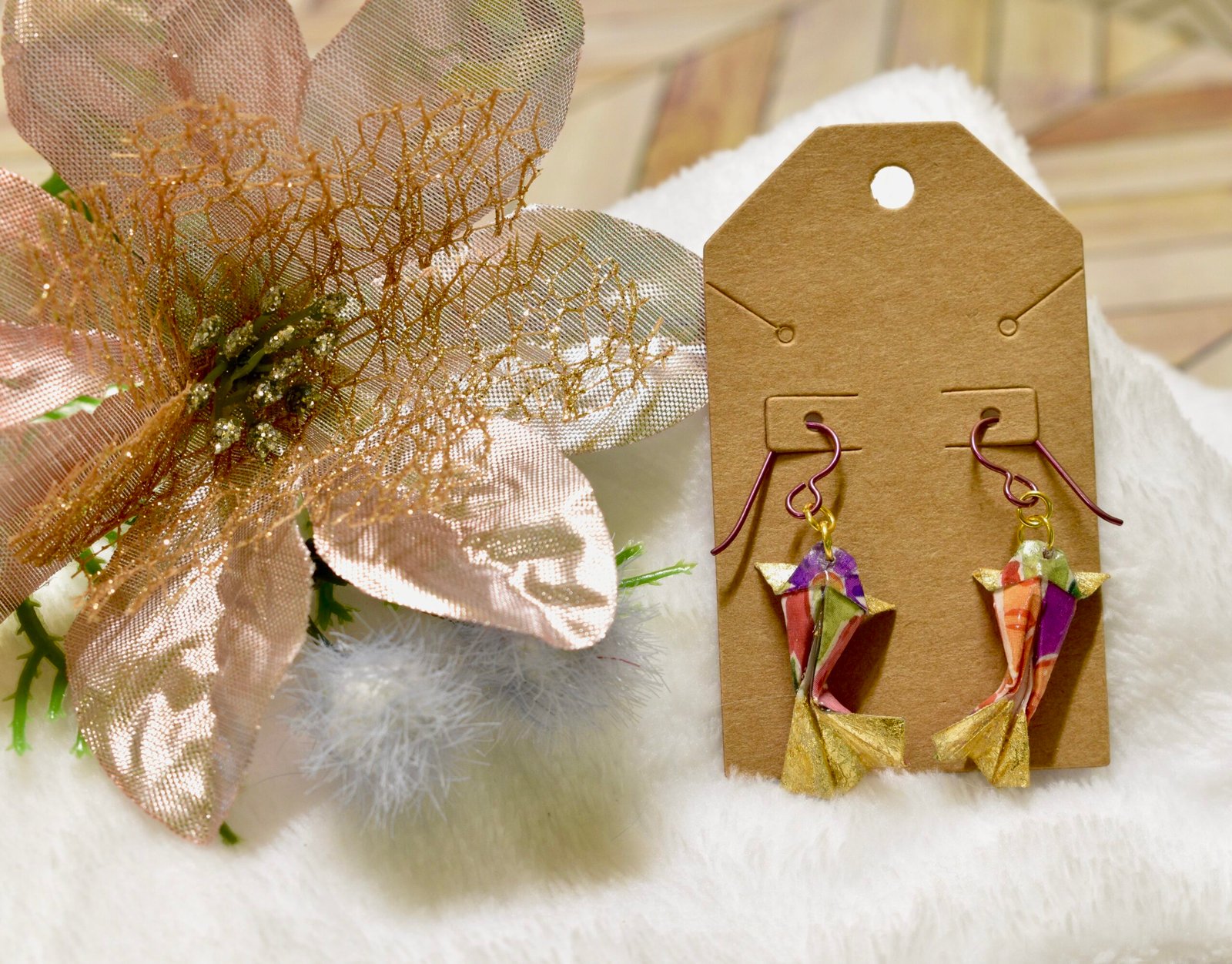 Origami koi fish of three different colors white, green, and multicolored. All of them have been gold leafed by hand. The white and green koi are on sterling silver hooks and the multicolored koi are on hypoallergenic hooks. There is a light coating of UV resin to give the paper a nice shine and helps it keep its shape.