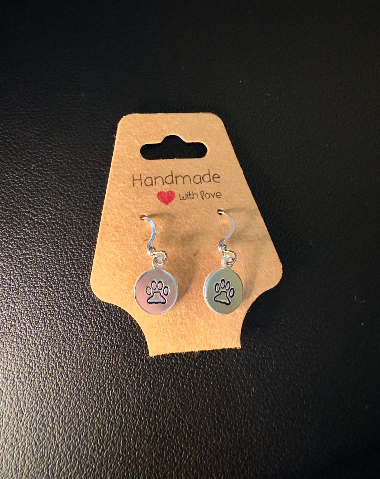 Rounded aluminum disks stamped with a paw print. The aluminum disk is stamped and painted by hand. The hooks are surgical steel. Each earring is handmade and will show small differences from the images.