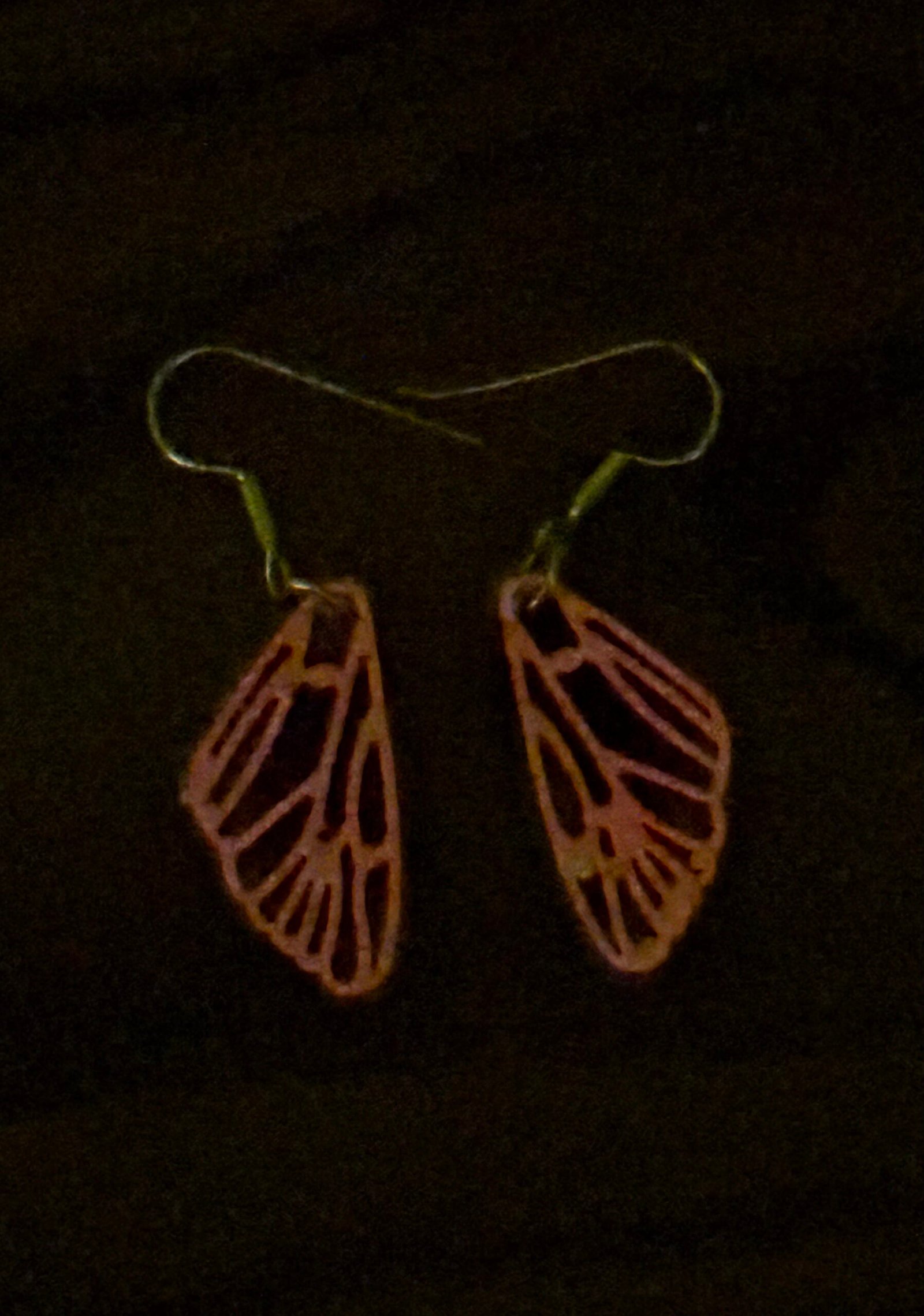 Small red and pink resin butterfly wings with glow in the dark paint in the creases. The hooks are sterling silver.