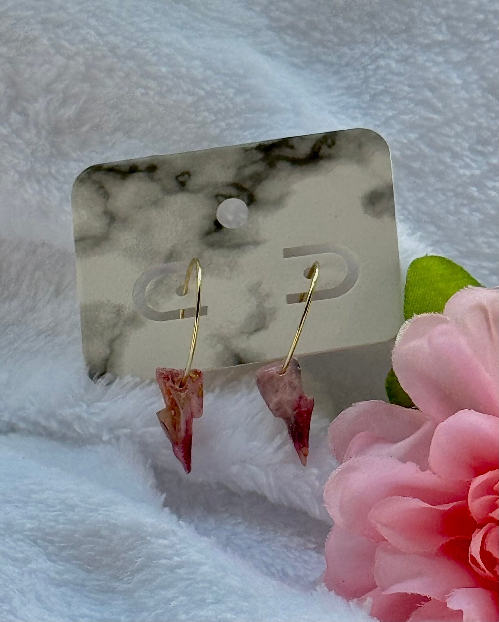 Pink marbled lightning bolts made from polymer clay. The clay is mixed and formed by hand and coated with a thin layer of UV resin for a nice shine. The hoops are surgical steel with a gold plate finish.