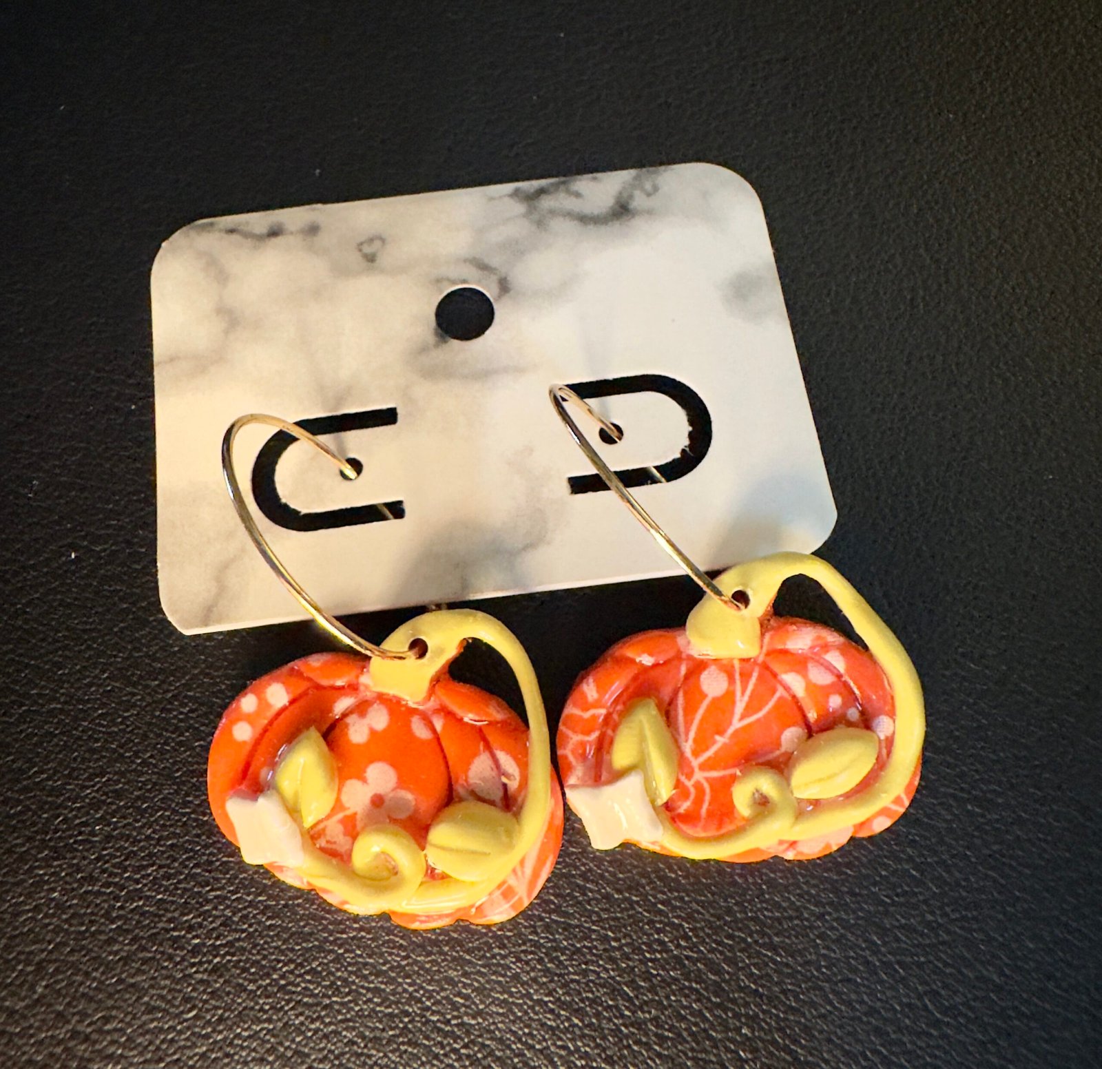 Orange pumpkin polymer clay earrings with white flower silk screen. There is a 3D green vine with leaves and a white butterfly laying across the pumpkin. The clay was mixed by hand to achieve that nice orange color and sealed in a coat of UV resin to get that nice shine that attracts the eye. The hoops are surgical steel gold plated.