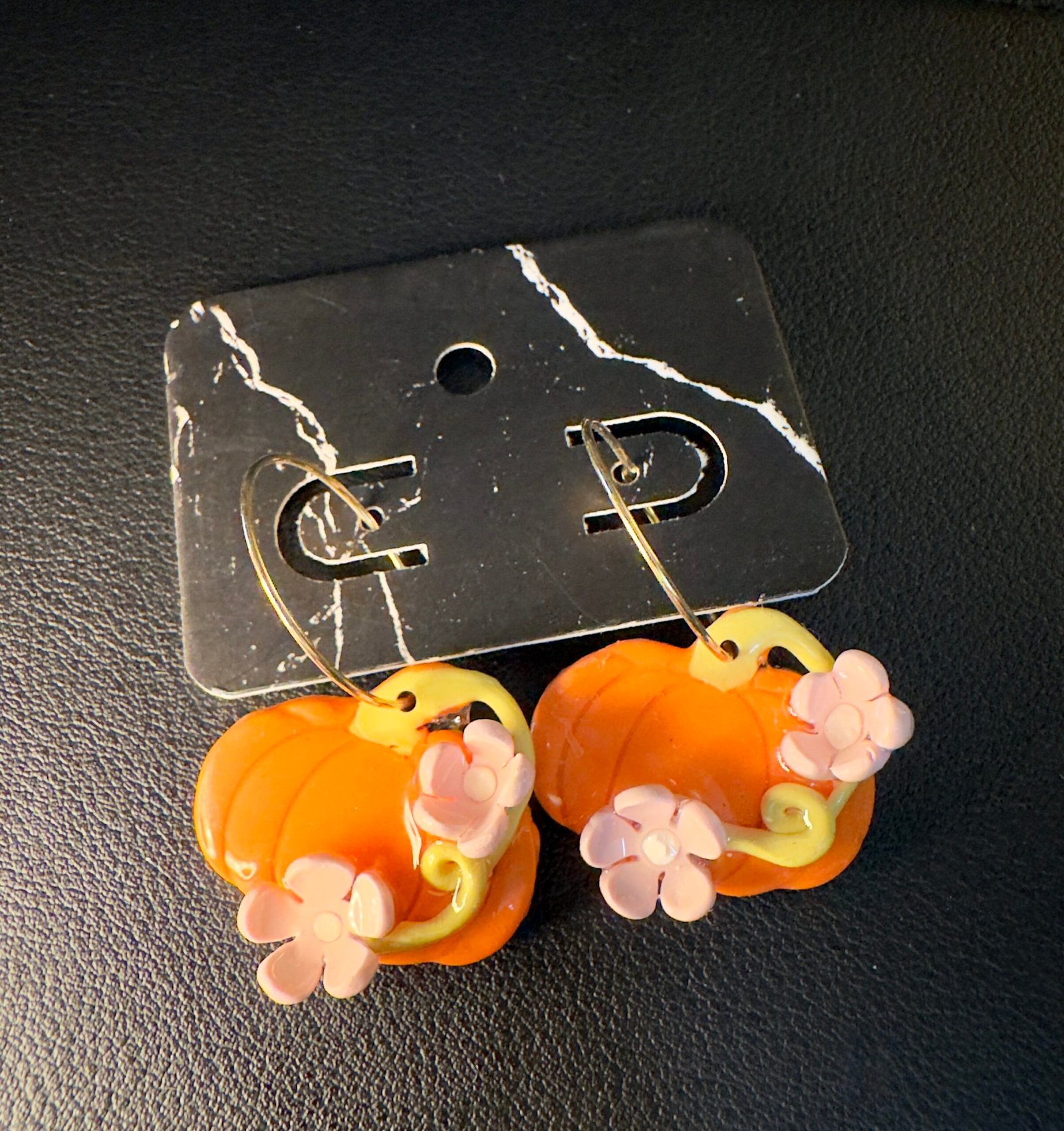 Orange pumpkin polymer clay earrings with a 3D green vine and pink flowers. The clay was mixed and formed by hand and sealed in a coat of UV resin to get that nice shine that attracts the eye. The hoops are surgical steel gold plated.