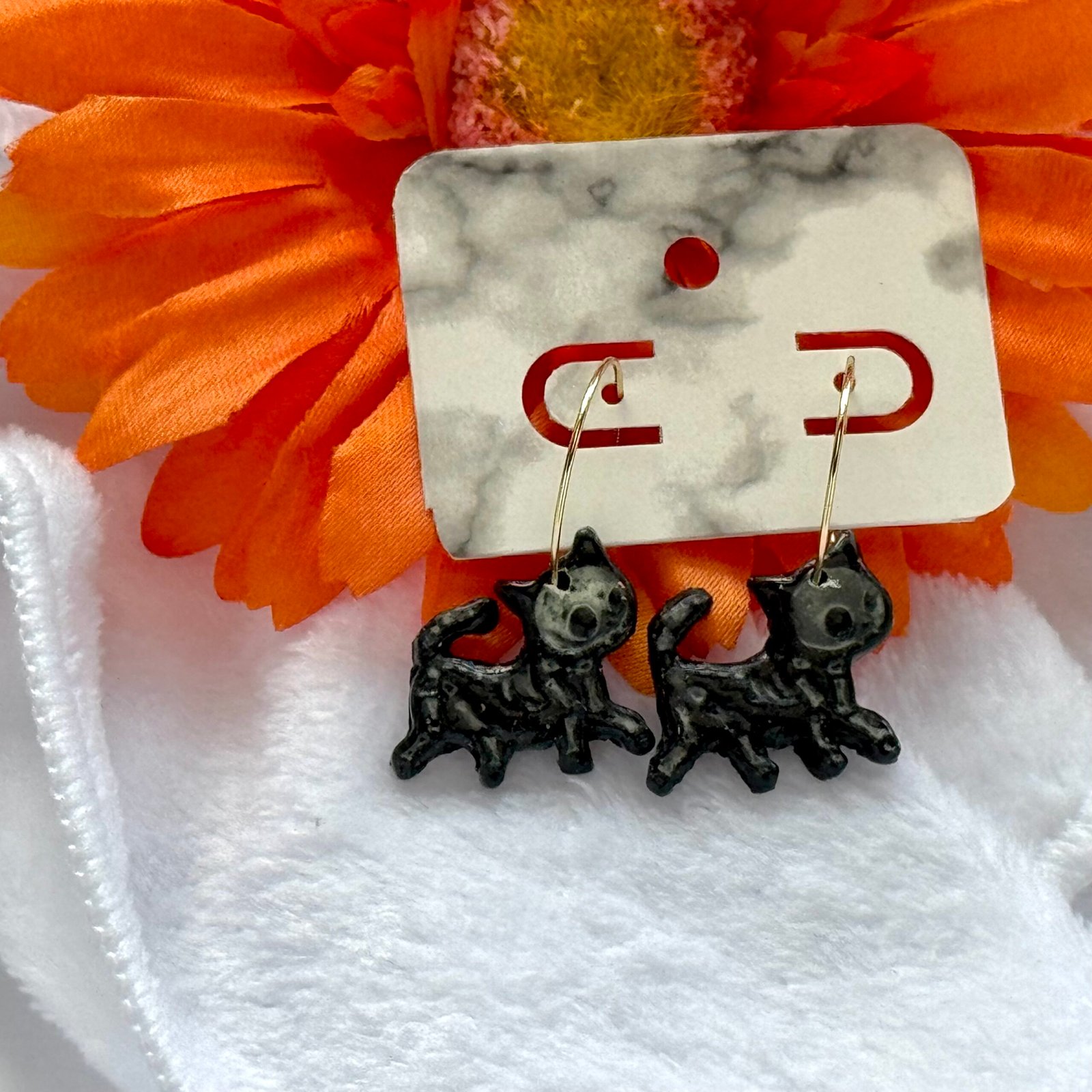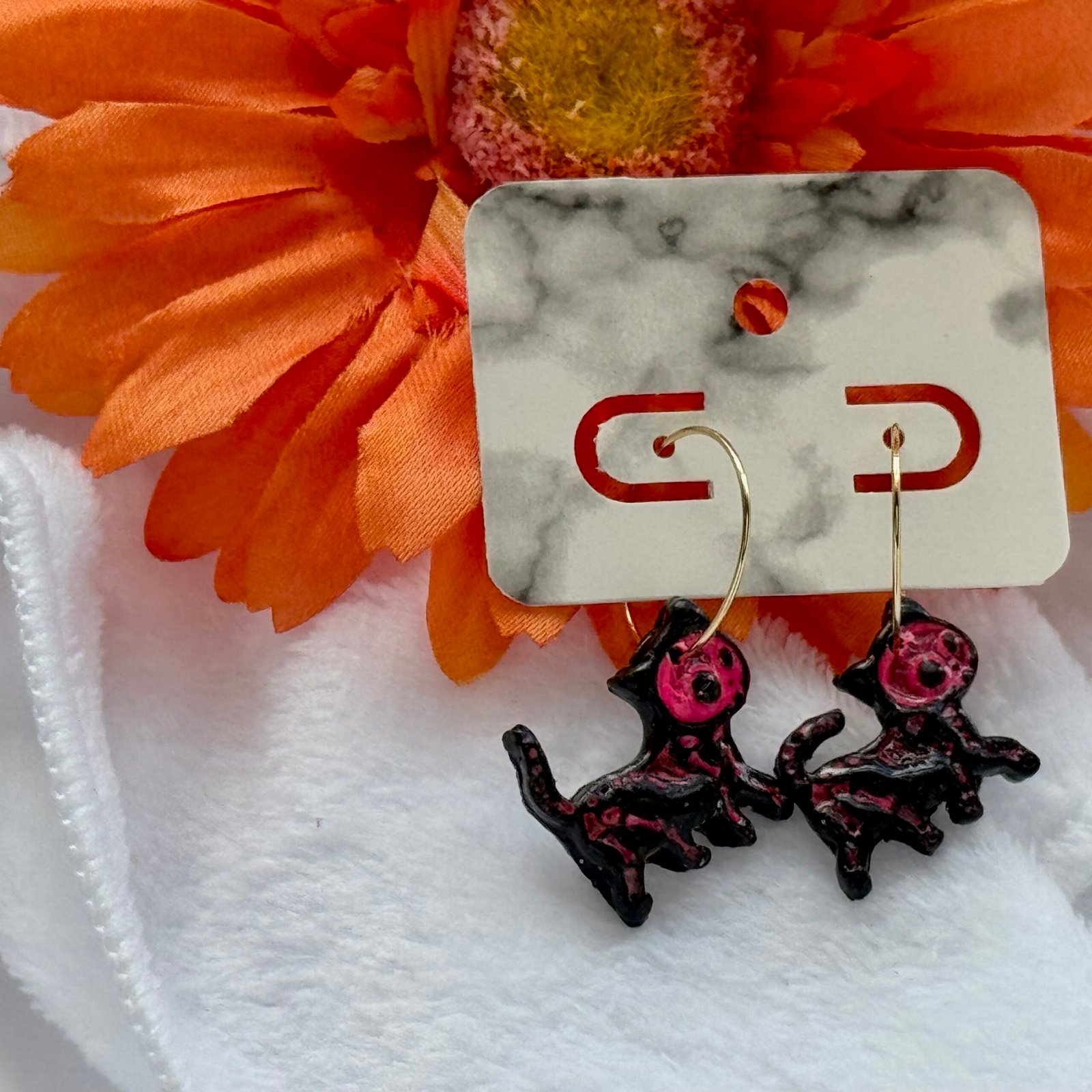 Cat skeletons made from polymer clay with glow in the dark paint. The clay and paint is done by hand and sealed with a coat of UV resin for a nice shine. The hoops are surgical steel with a gold platted finish.