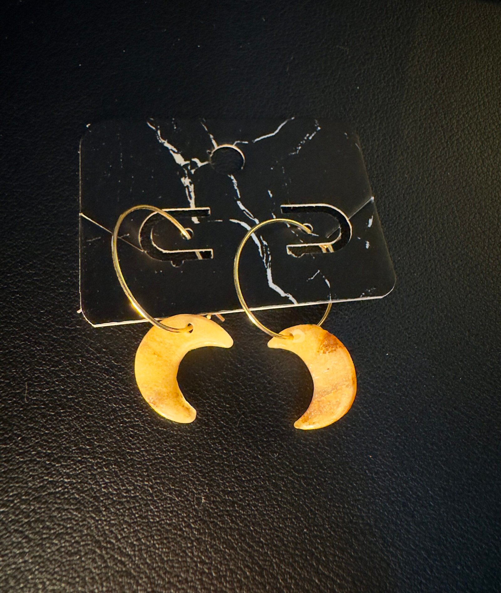 Tan and gold polymer clay crescent moons. The clay was mixed by hand to achieve that tan and gold color and sealed in a coat of UV resin to get that nice shine that attracts the eye. The hoops are surgical steel with a gold platting.