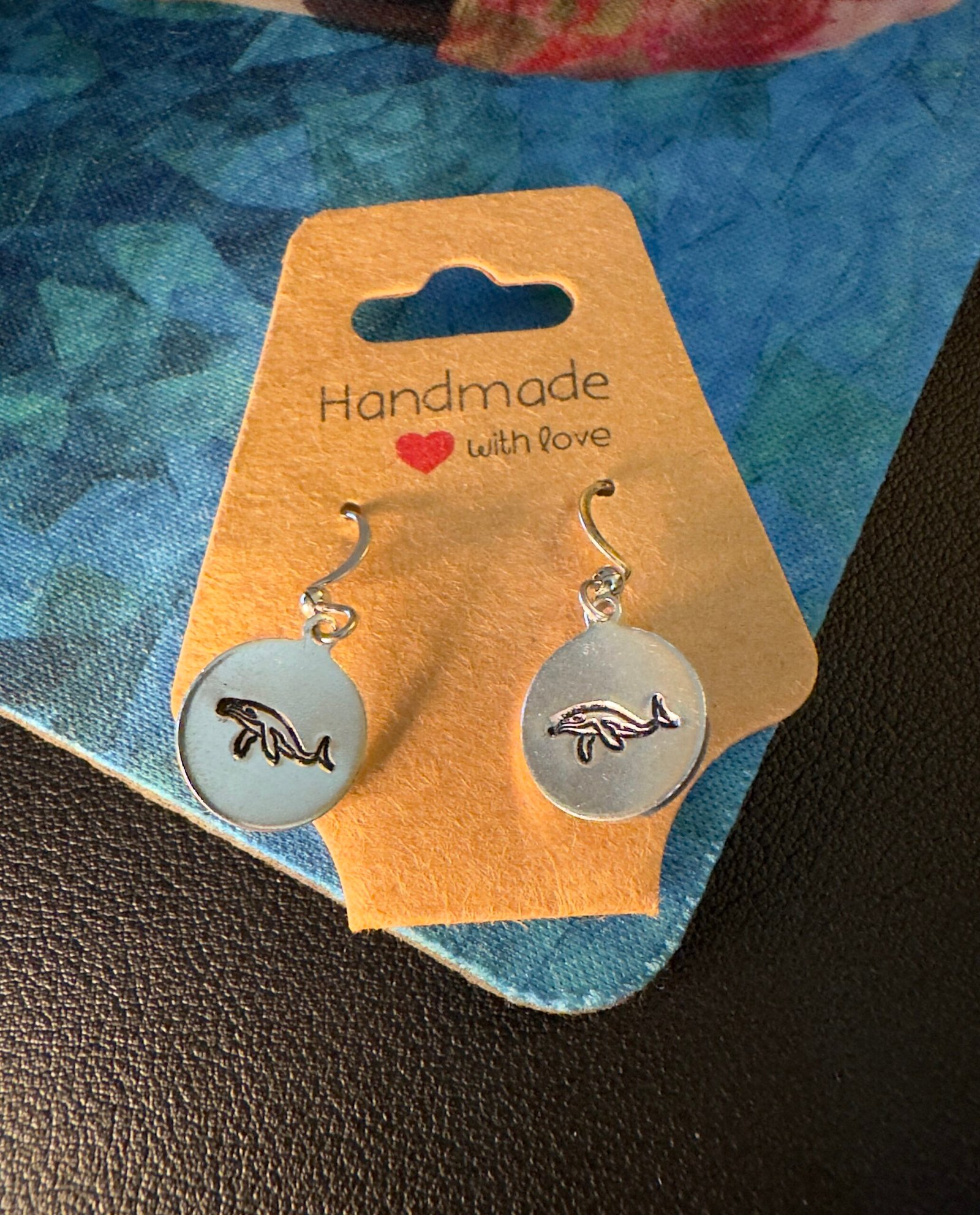 Rounded aluminum disks stamped with a whale. The aluminum disk is stamped and painted by hand. The hooks are surgical steel. Each earring is handmade and will show small differences from the images.